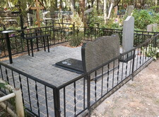 Так выглядит окончательный вариант места захоронения. По факту на этом участке мы переустановили памятники, восстановив одно из надгробий, покрасили оградку, замостили внутреннюю территорию брусчаткой и поставили лавочку со столиком. После окончания работ надписи на памятниках были дополнительно обработаны акриловой краской, это защитит их от пропадания в дождь и от пятен пыльцы растений и грязи.